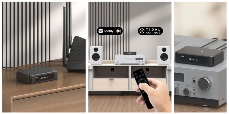 - Spotify Connect, Tidal Connect, DLNA / UPnP — atbalsta populāras straumēšanas platformas un vietējo mūziku no NAS vai ierīcēm.